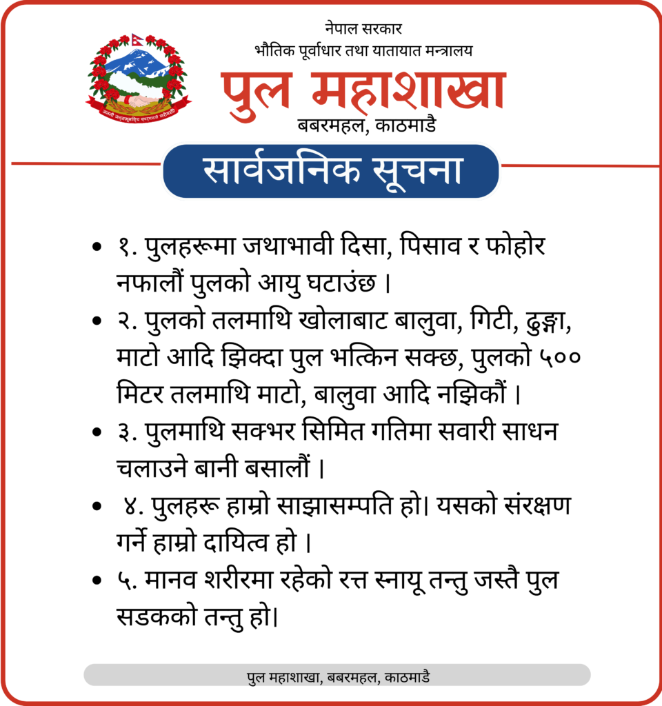 ढुंगा, गिट्टी र बालुवा उत्खन्न, व्यवस्थापन मापदण्ड २०७७ को दफा ४ (१०) मा ‘घना बस्ति र वन क्षेत्रको दुई किलोमिटर, राजमार्गको पाँचसय मिटर दुरीभित्रको नदी, सडक पुल तथा झोलुङ्गे पुलको एक किलोमिटर तल र पाँचसय मिटर माथिको नदीजन्य पदार्थ उत्खन्न र संकलन गर्न पाइने छैन ।’
